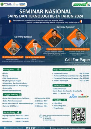 “Seminar Nasional Sains dan Teknologi (SNST) – Tantangan dan Inovasi dalam Bidang Otomotif dan Material Teknik menuju Tercapainya Teknologi Ramah Lingkungan yang Berkelanjutan” mengundang para ilmuwan, peneliti, mahasiswa, pemerintah dan para profesional untuk berdiskusi dan berbagi perspektif dalam pengembangan masa depan ramah lingkungan. Seminar ini akan diadakan pada 23 Oktober 2024 Online. SNST 14 akan berkontribusi menyediakan tempat untuk ide dan inisiatif baru serta menjalin kolaborasi penelitian tentang teknologi ramah lingkungan. Ini akan mendukung lingkungan yang kondusif bagi pendidikan dan yang berinteraksi langsung. Artikel yang dipresentasikan akan diterbitkan dalam prosiding terindeks Google Scholar. Serta paper yang terpilih akan dipublikasikan ke Jurnal Informatika dan Rekayasa Perangkat Lunak (Sinta 3), Jurnal Inovasi Teknik Kimia (Sinta 3) atau Jurnal Majalah Momentum (Sinta 4)